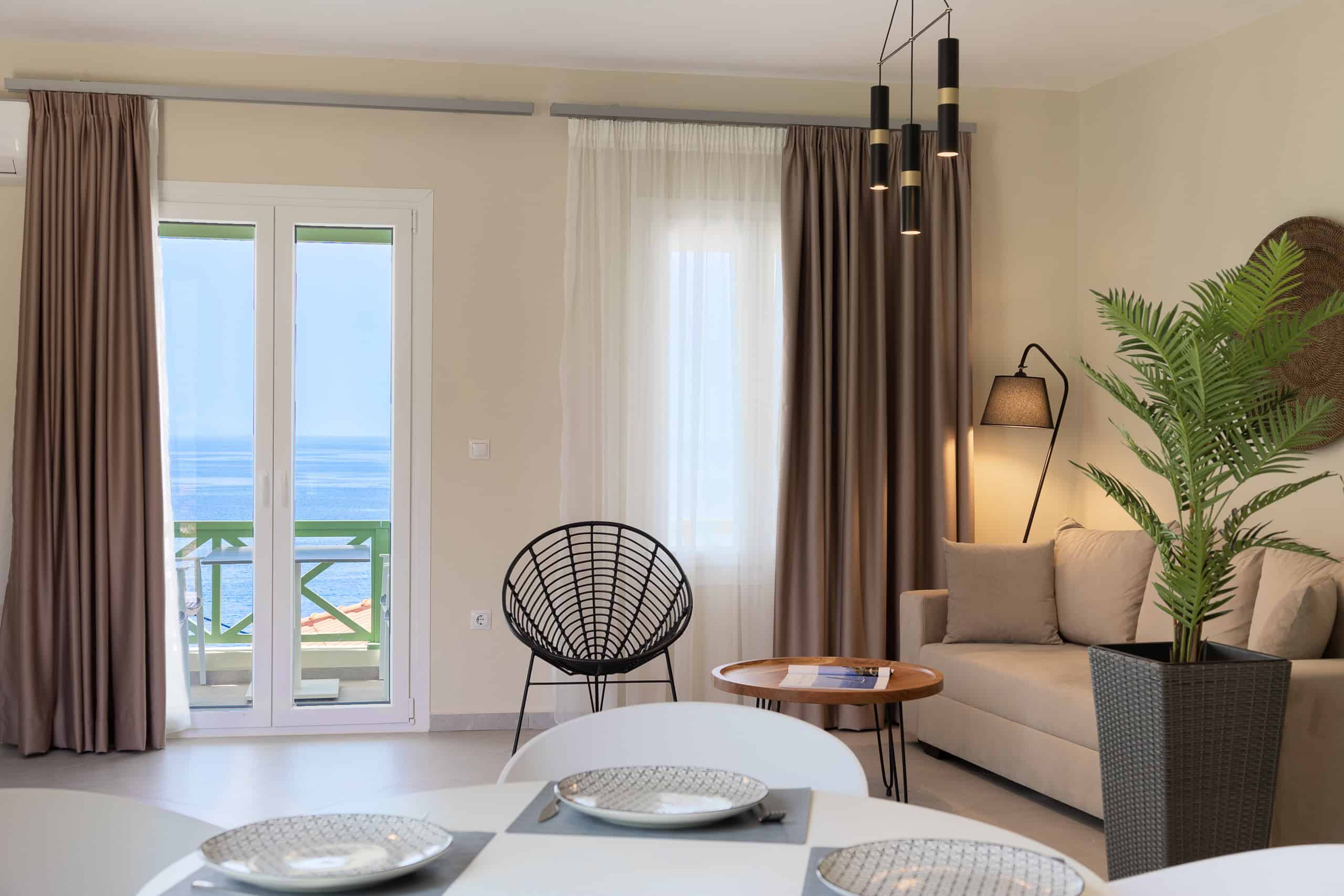 Κάθε σουίτα διαθέτει επιπλωμένο μπαλκόνι απ’ όπου μπορείτε να απολαύσετε την μαγευτική θέα, καθώς και σύγχρονες ανέσεις όπως κλιματισμό, τηλεοράσεις σε όλους τους χώρους, άνετα King-Size κρεβάτια, ευρύχωρους καθιστικούς χώρους με 3θέσιους καναπέδες-κρεβάτι (διπλό), πρακτικές τραπεζαρίες στις πλήρως εξοπλισμένες κουζίνες και απεριόριστο δωρεάν ίντερνετ.
